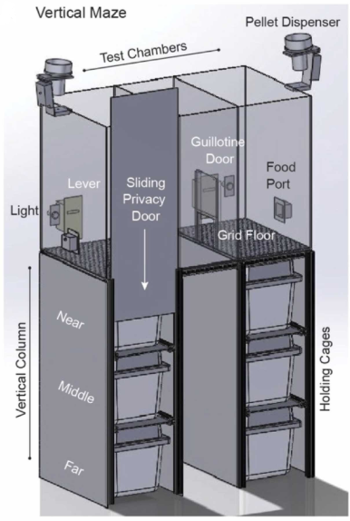 The VM expands on conventional three-chambered social mazes by adding a vertical dimension, allowing researchers to present social stimuli (i.e., conspecifics) at varying heights and distances. This setup mimics the layered spatial environments rodents naturally encounter and engages multiple sensory modalities including olfaction, vision, and audition. Through both spontaneous exploration and operant conditioning paradigms, the VM enables precise measurements of how animals integrate spatial layout and social information to guide behavior.