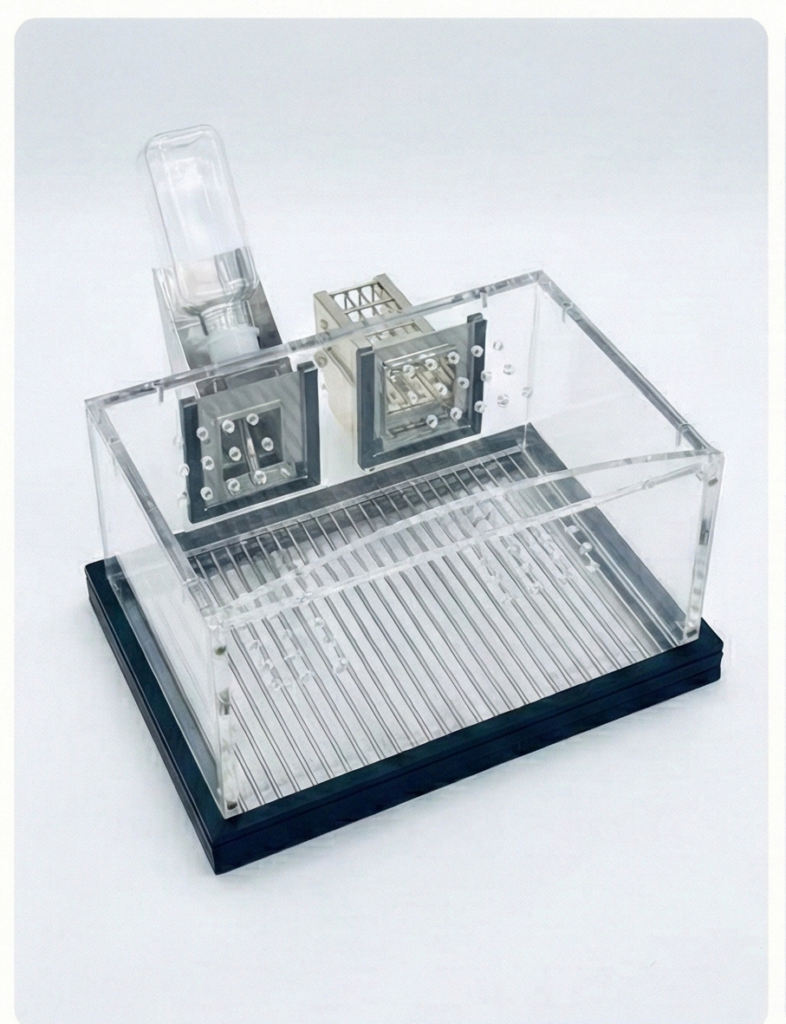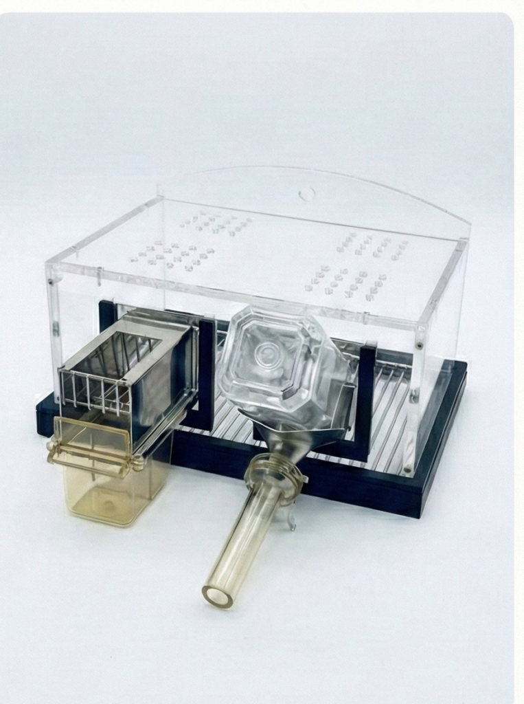 The Food Hopper can easily be used to measure food intake and monitor feeding patterns of rodents. The upside-down “L” shaped design and the small opening used to access food from the Food Hopper helps reduce spillage to a minimum. The Food Hopper comes with a plastic cage that has a wire grid placed 2 cm from the bottom of the cage, therefore, if any spillage occurs, it falls beneath the wire grid and can easily be collected. The Food Hopper can easily be removed from the cage and also be used with other types of cages. Apart from measuring food intake, the Food Hopper can also be used to observe food preferences in rodents.