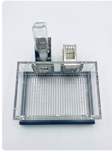The Food Hopper can easily be used to measure food intake and monitor feeding patterns of rodents. The upside-down “L” shaped design and the small opening used to access food from the Food Hopper helps reduce spillage to a minimum. The Food Hopper comes with a plastic cage that has a wire grid placed 2 cm from the bottom of the cage, therefore, if any spillage occurs, it falls beneath the wire grid and can easily be collected. The Food Hopper can easily be removed from the cage and also be used with other types of cages. Apart from measuring food intake, the Food Hopper can also be used to observe food preferences in rodents.