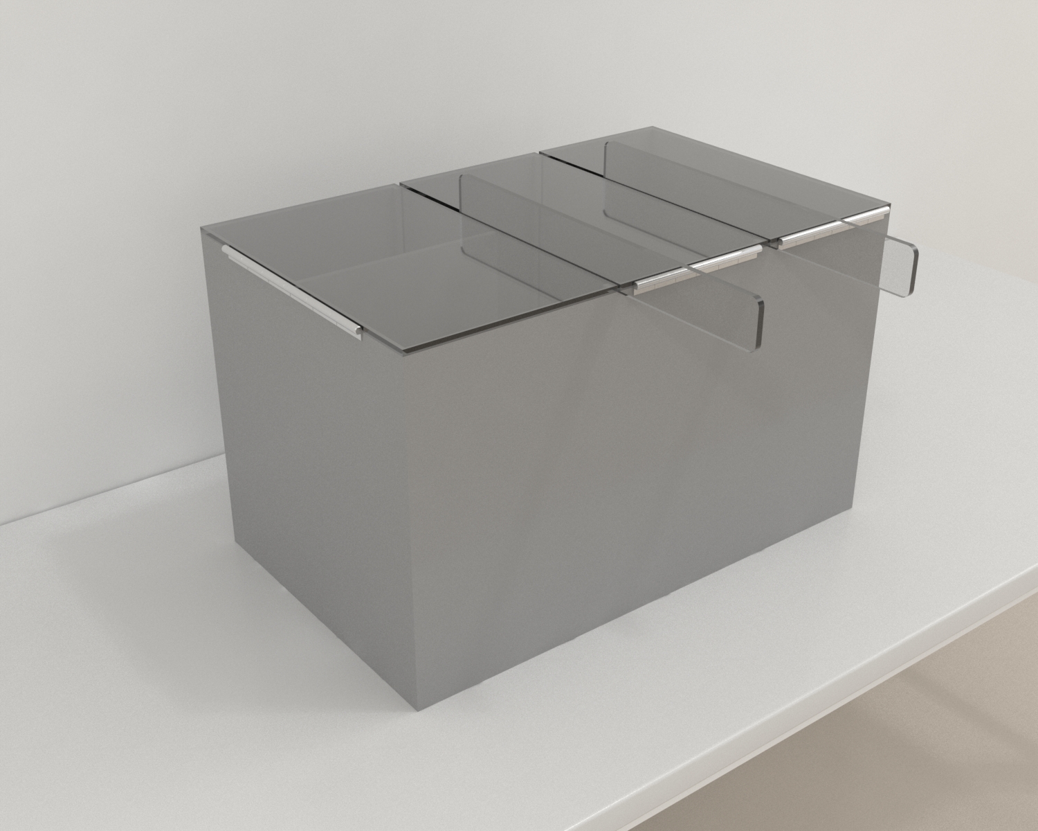 - Flip-up lids x2 for the first 2 sections: 8.75 x 4.25 (a 0.75-inch gap between each lid)