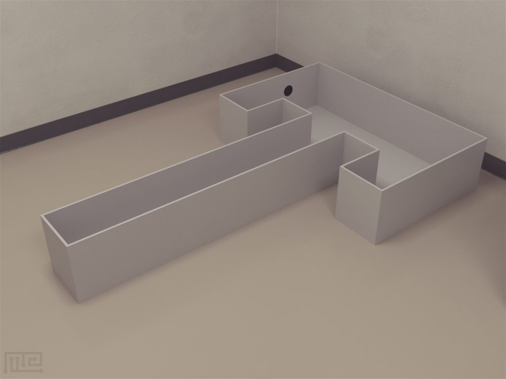 The piglet T-maze consists of a start alleyway and two choice arms. The arms of the maze have a width of about 2.4m to accommodate the animal. Overall the apparatus is 1.2m wide and 1.98m long. Each goal arm is equipped with a goal box that is only visible to the piglet once it has committed to a goal arm. Behind each goal arm is a bowl of food replacer which is not visible to the piglets. The device permits the addition of a visual discrimination element at the intersection of the maze.