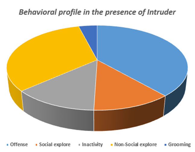For behavior depicting violence, the same protocol is followed both for the residents and intruders. Behavioral parameters like attack latency, the ratio between the frequencies of lateral threats and clinches, bites at target sites, and behavior of the intruder in a new environment are observed. A very short latency is the first indicator of violence.