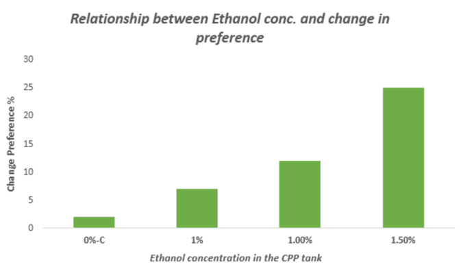 The sample data represents the co-relation between ethanol concentration and change in preference (%) in zebrafish. It is evident from the graph that with the increasing ethanol conc. in the CPP tank, the subjects spend more time in the conditioned compartment.