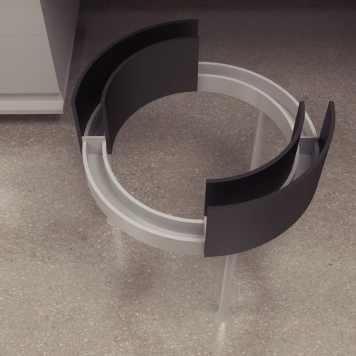 The design is created with an elevated circular platform with two walled, enclosed portions as well as two open portions, allowing for clear interpretations of murine behavior. Because mice tend to avoid open-spaced areas, the animals will preferentially spend more time in the enclosed walled area.