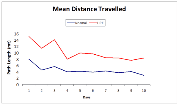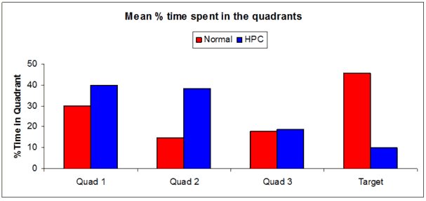 During the probe trials data is also collected for mean percentage of time spent exploring the four quadrants. The path chosen by the subject also reveals significant information on the dynamics of spatial performances. The returns and path perseveration reflect the new spatial relation created or discovered by the subject.